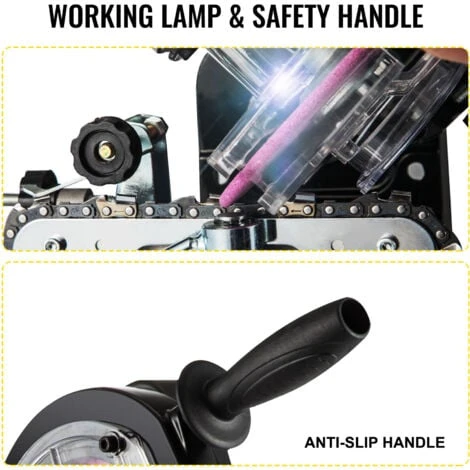 - 【Morsa inclinabile e mole abrasive】 – La morsa inclinabile sugli affilatrici per motoseghe è adatta per frese a scalpello e semi-scalpello. E le grandi mole da 5,5” possono aiutarti ad affilare la catena in modo più efficiente.