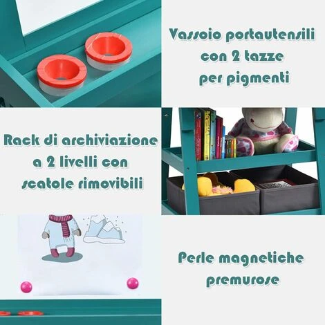 Il nostro cavalletto è un regalo perfetto per i tuoi piccoli artisti! Con una lavagna nera e bianca, i tuoi bambini potranno disegnare con i loro amici e rafforzare l’amicizia. Il rotolo di carta in alto offre più spazio per disegnare e creare. I 2 vassoi nella parte inferiore sono perfetti per riporre tutti gli accessori per averli a portata di mano. Con 2 mensole e 2 scatole di tessuto, ha tanto spazio per organizzare tutti gli accessori. In MDF resistente e con una struttura triangolare stabile, garantisce la sicurezza durante l’uso. Lascia che i tuoi bambini diano libero sfogo all’immaginazione con questo cavalletto.