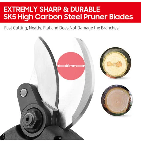 Lama in acciaio speciale SK5 di alta qualità: estremamente affilata e resistente, può tagliare rami con un diametro massimo di 40 mm, aumentare l’efficienza di potatura del 300% rispetto alle cesoie tradizionali, perfetta per tagliare steli e rami leggeri.