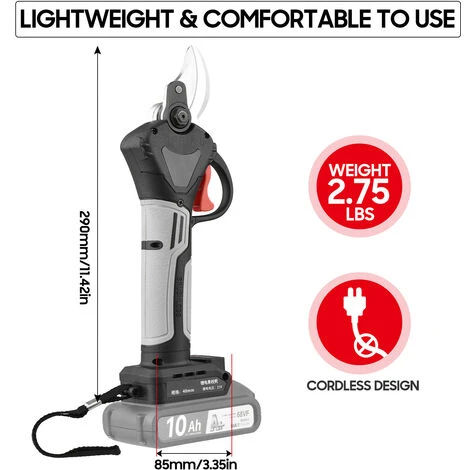 Potente motore brushless: le cesoie elettriche professionali senza fili da 21 V adottano un motore brushless che fornisce il 50% di autonomia in più, aumentando del 30% l’efficienza di potatura, inoltre la sua durata è da 3 a 5 volte quella di un motore a spazzole convenzionale che consente di risparmiare notevolmente costi di manutenzione dovuti a danni al motore.