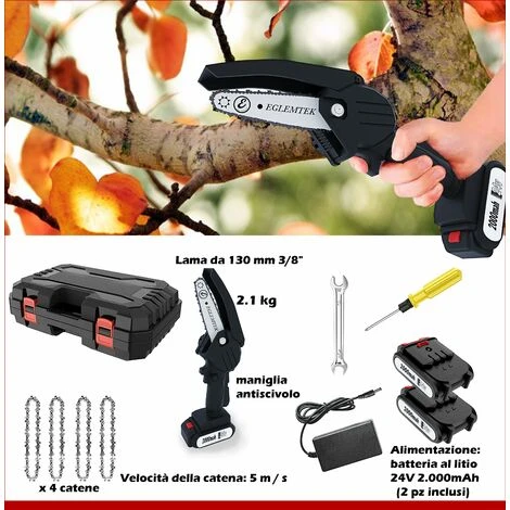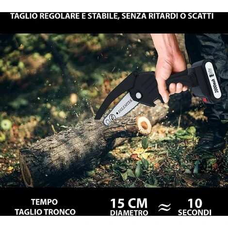 Rispetto alle seghe tradizionali, non necessita di benzina perchè è alimentata da una batteria al litio da 24V con 2000mah dalla ricarica veloce e che ne garantisce l’utilizzo fino a 3 ore.
