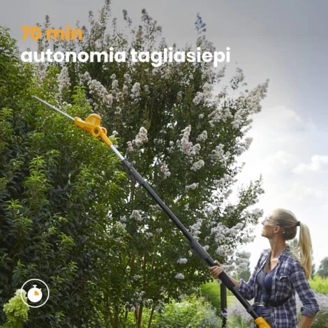 Il versatile attrezzo multifunzione a batteria senza fili STIGA comprende un accessorio tagliasiepi (150 W), un braccio potatore (280 W) e una prolunga telescopica da 55 cm che consente di raggiungere le siepi e i rami più alti del giardino senza scala. È adatto a lavori semplici e veloci. Facile da avviare e manovrare, è compatto ed ergonomico grazie all’impugnatura morbida. È comodo con un bilanciamento ottimale e si può agganciare a una pratica bretella per un minor affaticamento. L’attrezzo dispone di una batteria intelligente STIGA ePower 20V 4Ah (caricatore Europlug incluso), che permette di passare rapidamente dal tagliasiepi al potatore. Offre fino a 70 minuti di taglio e 20 di potatura con un’unica ricarica. Il tagliasiepi ha una lama da 45 cm per lavori in elevazione e una testina rotante fino a 112°. Il potatore è dotato di una barra e una catena di alta qualità per un taglio veloce e preciso di rami di piccolo diametro.