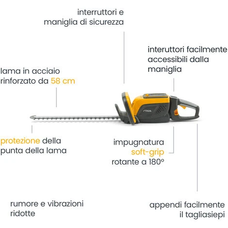 Le sue lame a doppia azione da 58 cm tagliate al laser si prendono cura di siepi e cespugli senza alcuna fatica, mentre l’impugnatura rotante a 180° può essere impostata in tre diverse posizioni per non sforzare eccessivamente le braccia e i polsi.