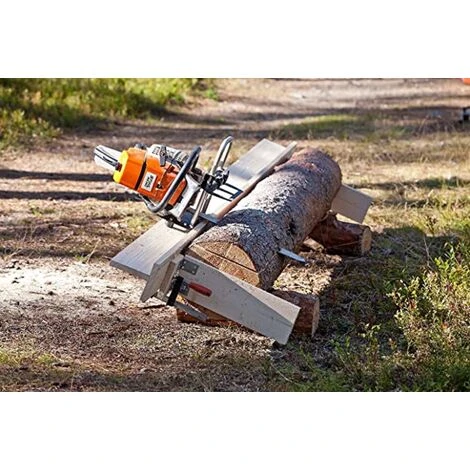 Un vantaggio è che la macchina è montata con gli stessi bulloni della lama della sega. Quindi non è necessario praticare ulteriori fori nella lama. Un altro vantaggio è che lo Smart-Timberjig include anche staffe di montaggio e viti per costruire possibilmente binari di guida diritti in legno. Queste guide vengono utilizzate solo per creare una superficie piana sui primi due tagli. Quindi lo Smart-Timberjig poggia su una propria guida regolabile che determina lo spessore delle assi. Per i tronchi più piccoli ti consigliamo di mettere il busto all’altezza dei fianchi per stare in una buona postura di lavoro.
